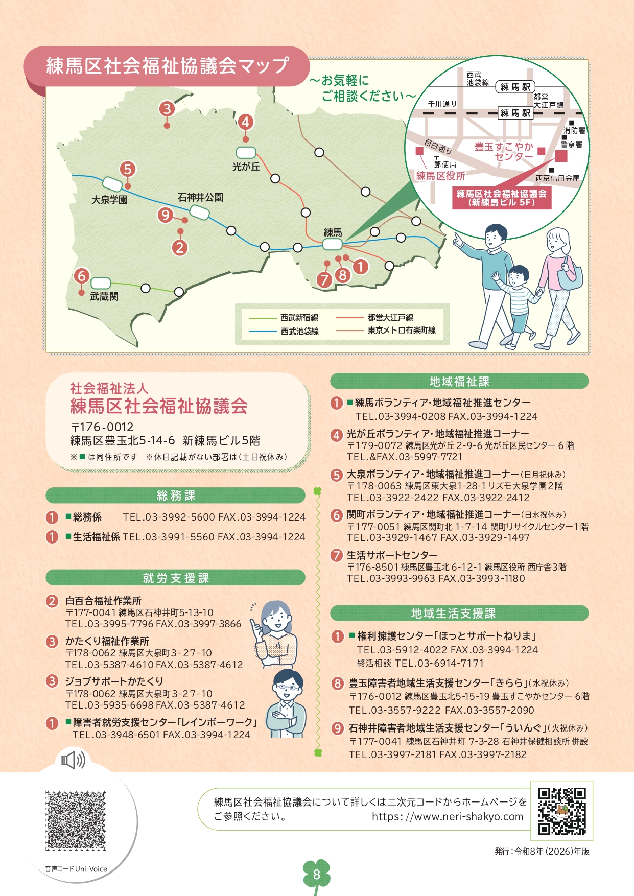 練馬区社会福祉協議会マップ 新練馬ビル5階には、自由に使えるフリースペースがございます。 新練馬ビルには、身体が不自由な方などを除き、駐車スペースがありません。また駐車スペースに限りがあるため、利用が必要な方は、事前にご相談ください。 駐車、駐輪スペースがないため、車・二輪車・自転車での来所はご遠慮ください。 各部署別連絡先 総務課 総務係 生活福祉係 経営課 経営企画係 就労支援課 白百合福祉作業所 かたくり福祉作業所 障害者就労支援センター「レインボーワーク」 地域福祉課 練馬ボランティア・地域福祉推進センター 生活サポートセンター 地域生活支援課 権利擁護センター「ほっとサポートねりま」 豊玉障害者地域生活支援センター「きらら」 石神井障害者地域生活支援センター「ういんぐ」